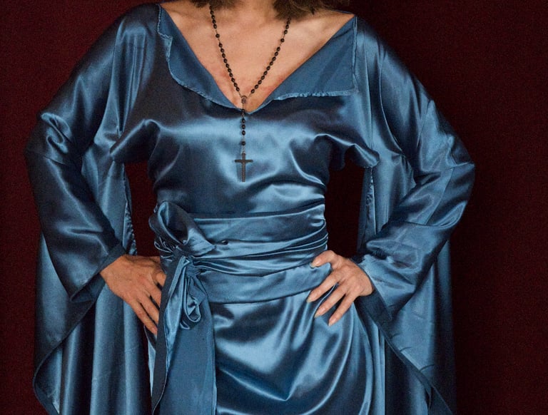 The ZZOLU ZIMONO dress: In turquoise blue, made of satin fabric, knee length with a v-neckline that can also be closed, with a wide belt.